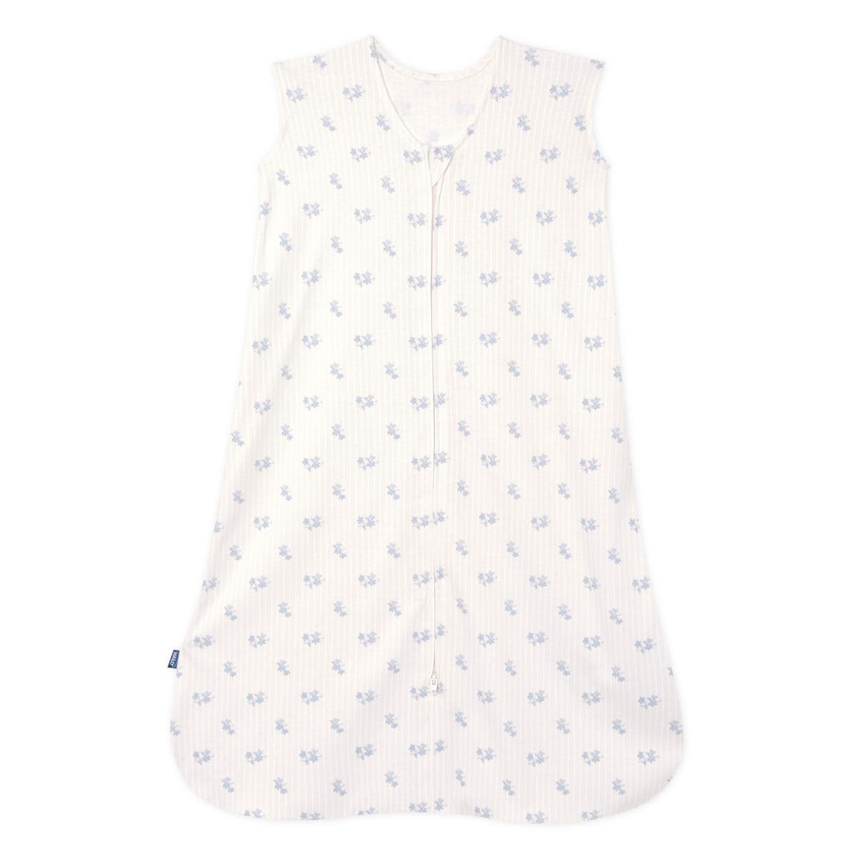 The HALO Wearable Blanket is a 100% cotton, TOG 0.5 sleeveless sleep sack with a front zipper and light background, adorned with a breathable pattern of small blue flowers for safe and stylish sleep.