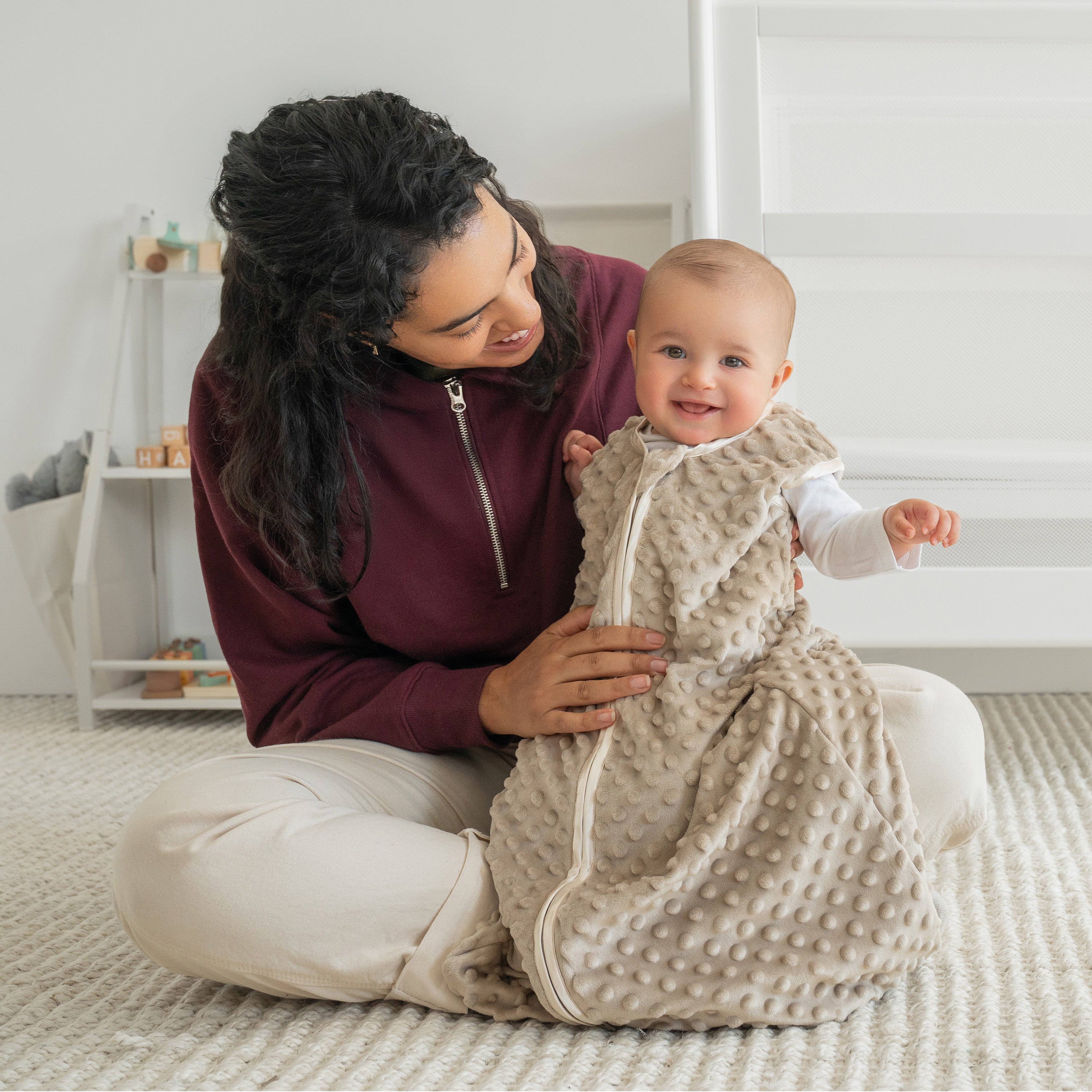 The HALO Wearable Blanket Plushy Dot Velboa TOG 1.5 is a beige, sleeveless sleep sack made of soft fabric with raised dots and a full-length front zipper for safe and comfortable sleep.
